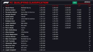 George Russel, da Mercedes, largará em terceiro, seguido por Carlos Sainz, da Ferrari. A boa nova do treino foi a presença do novato Oscar Piastri, da McLaren, no Q3. O piloto francês surpreendeu e vai largar na nona posição.